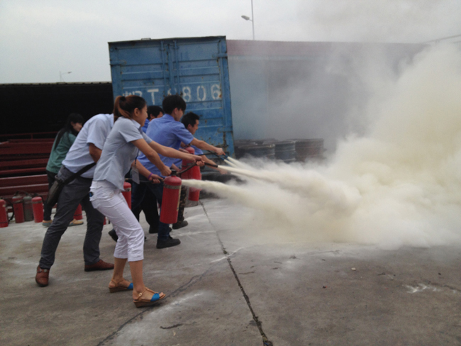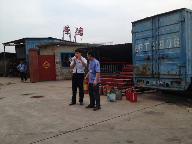 2、消防知识培训。等大家集中到了厂外安全区域后,由义务消防队人员对全员进行灭火器材的使用方法。主要是干粉灭火器和消防栓的使用。安全主任谢京亮边讲解边模拟使用传授给所有员工灭火器的使用步骤:摇一摇、拔下插销、瞄准火焰根部、压下把手、来回扫射。