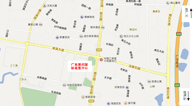 深圳或广州方向走广深高速厚街出口下高速,转“博览大道”再转“会展东路”,到达莞太路和家具大道交叉处即到。导航:广东现代国际展览中心、嘉华大酒店