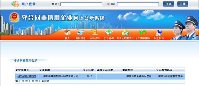 近日,广东省工商行政管理局向社会公示了全省“守合同重信用”企业名单,深圳市荣德机器人科技有限公司喜获上榜,首次荣获该荣誉称号。