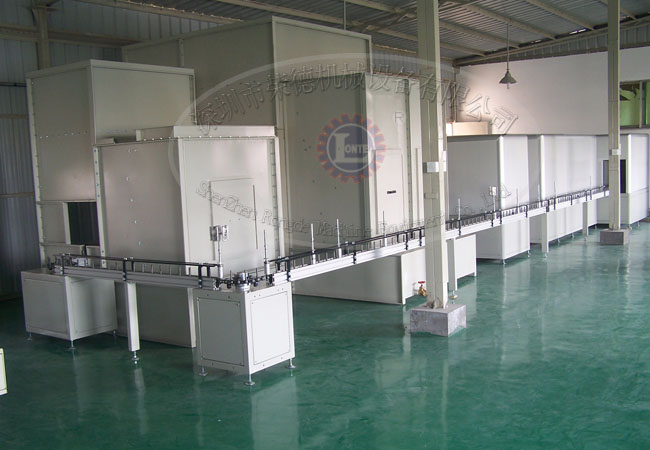 手机外壳喷涂线(spindle喷涂线): 静电除尘、喷涂、烘干全自动流水线作业,用人少,适合批量连续生产,产量高、涂层面均匀;全封闭无人操作喷涂作业;生产合格率高,品质稳定;输送链条与轨道接触点配置轴承配合精准的轨道,运转时轻快顺畅、平稳不抖动。
