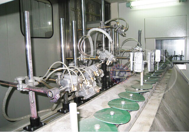 Ω静电自动喷涂设备,是将输送轨弯曲成Ω形,工件围绕圆盘式静电喷枪周围通过,并在喷涂过程中自转,圆盘喷枪上下移动进行自动喷涂。由于工件围绕圆盘喷枪通过,工件相对喷枪的时间较长,允许输送链速度较高,故生产效率较高。圆盘喷枪上下移动行程及速度,可依据工件外形来调节,提高涂膜质量。