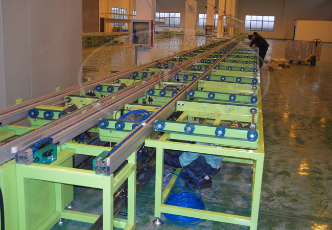 整套自动生产线设备分为两部分其中一部分为上下两层式回流行倍速链,另一部分为单层上方流水式倍速链。每个部分分多段式拼接每段长12m不足的按照实际长度加工。整体用60*60*4mm方通焊接机架,表面烤漆处理,每段需配备气源过滤器1个安装在中间位、快速接头5个以及插座3个均匀分布在流水线上,中间布200*100mm厚1.2mm镀锌线槽以及1寸镀锌气管,马达采用750W台湾变频电机,采用尼龙倍速链。