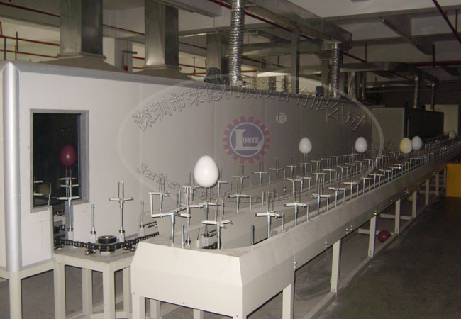 万圣节工艺品两涂两烤喷漆线:两组喷枪,第一涂底漆、第二涂?;っ嫫幔肪酵亢笤倬酱蔚目竞?,使产品的外观品质更佳。